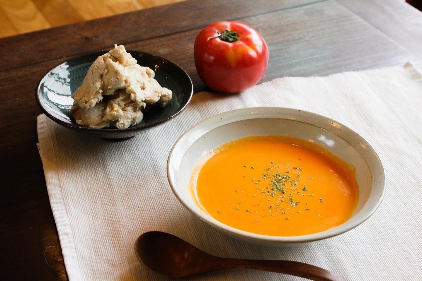 PanBooが京都の酒蔵「佐々木酒造」さんの全面協力の元、コラボ商品として開発した、温製でも冷製でも美味しい酒粕を使ったスープです。酒粕の他、栽培中農薬・化学肥料不使用の完熟トマトや『自然循環農法』で飼われていた鴨の出汁など、SDGsに配慮した材料を厳選して使用しています。